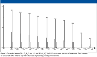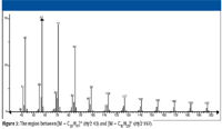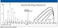 Consider the mass spectrum of hexacosane shown in Figure 1. It is easy to understand that the peaks separated sequentially by 14 m/z units represent ions formed by the loss of successively larger alkyl radicals of the form CnH(2n + 1) from different molecular ions. Different molecular ions fragment with the loss of different-sized radicals to produce correspondingly different-sized fragment ions. Clusters of peaks with lower intensities are observed near the peak representing each of these fragment ions. Careful examination of the spectrum reveals that each of the peaks representing fragment ions (which are primary carbenium ions) in the mass spectrum (at odd m/z values) has an associated peak one m/z unit higher, which is the carbon-13 isotope peak. Moreover, as the m/z value of the fragment ion decreases, peaks one, two, and in some cases three or four m/z units less begin to become obvious (see Figures 2 and 3 for an expanded view of the spectrum).