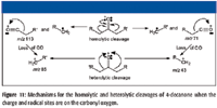 Figure 11 illustrates what products will be formed by homolytic and heterolytic cleavage of the molecular ion of this C5H11CH2 (CO)CH2C2H5 ketone. It is now clear that R can be considered to have two atoms of carbon, and R' can be considered to have five atoms of carbon. This means that the R acylium ion will have an m/z value of 71, and the R' acylium ion will have an m/z value of 113. The H2+C-R ion, produced by heterolytic cleavage of the molecular ion with the loss of a H7C3C+•=O radical or by the loss of a molecule of CO from the C6H13C≡O+ acylium ion, will have an m/z value of 85. The H2+C-R' ion, produced by heterolytic cleavage of the molecular ion with the loss of a H13C6C+•=O radical or by the loss of a molecule of CO from the C3H7C≡O+ acylium ion, will have an m/z value of 43. Examination of the mass spectrum in Figure 7 shows that these peaks are present; however, these peaks alone do not necessarily give an indication of the arrangement of the atoms in the six-carbon-atom side chain.