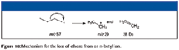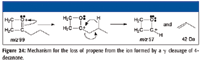 Examination of the product-ion mass spectrum (Figure 16) of the precursor ion of m/z 85 from the mass spectrum of 4-decanone also indicates that the ions with m/z 57 and m/z 43 are a result of the fragmentation of ions with m/z 85 with the respective losses of ethene (28 Da) and propene (42 Da). Some of the ion current at m/z 43 in the original mass spectrum is the result of heterolytic cleavage at the number 3 carbon atom of the molecular ion (Figure 11). The product-ion mass spectrum of m/z 85 also indicates that ions of m/z 41 and m/z 29 could be formed by the ions with m/z 57. This is confirmed by examination of the product-ion mass spectrum of the ion with m/z 57 (Figure 17) from the original EI mass spectrum (Figure 7). Figures 18 and 19 show possible mechanisms for the formation of ions with m/z 29 (loss of ethene) and m/z 41 (loss of methane) from the aliphatic ion with m/z 57. There is no support for the formation of the ion with m/z 69 from the product ion mass spectrum produced by the ion with m/z 85 (Figure 16), and it will be necessary to look elsewhere for the sources of the ions with m/z 67 and 69.
