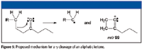 Aliphatic ketones with a γ carbon that is a non-ω carbon will undergo a γ cleavage (analogous to an α cleavage; not the same as a γ-hydrogen shift-induced β cleavage), resulting in a four-membered cyclic oxonium ion as shown in Figure 5 for a ketone with the carbonyl on the number 4 carbon atom (2). This mechanism dominates over β cleavage or even δ cleavage or ε cleavage. This was confirmed by the examination of the mass spectra of a number of aliphatic ketones with a branch containing four atoms of carbon and another branch with four or more carbon atoms. This γ cleavage could account for the peak at m/z 99. If this is the case, then structures b and d in Figure 11 can no longer be considered to be candidates for this spectrum because of the substitution on the β carbon, which would mean that a loss due to γ cleavage would be less than 57 for molecular ions of these compounds.