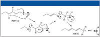 As shown in Figure 12, the acylium ion with m/z 113 loses H2O to produce the even electron diene H3C–CH2–CH2=CH–CH=CH–CH2+. Then, based on the product ion mass spectrum of m/z 95, some of these ions lose ethene (H2C=CH2) to form ions of m/z 67; others lose a molecule with an elemental composition of C3H4 (H2C=C=CH2 or H3C–C≡CH) and a mass of 40 Da to form the ion with m/z 55. The mechanism for this latter loss is much more difficult to propose than the loss of ethene.