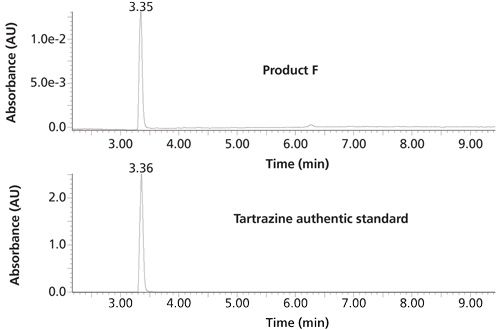 Figure 17: LC–UV chromatograms of product F and an authentic sample of tartrazine (430 nm).