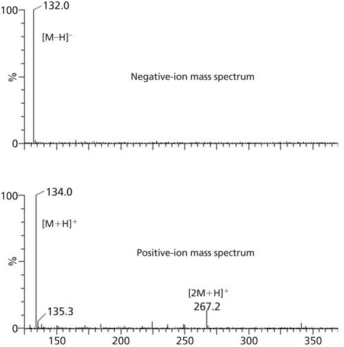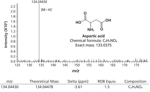 A tablet of suspected counterfeit product B was received following initial determination of counterfeit status by Raman spectroscopy. No additional structural information was obtained from the Raman analysis. A portion of the counterfeit tablet was extracted with 50:50 acetonitrile-water and sonicated for 20 min. The extracted liquid was filtered and diluted (1:10) for LC–UV-MS analysis. No significant components were detected in the LC–UV chromatogram; however, a poorly retained component was detected in both the positive- and negative-ion ESI total ion chromatograms as shown in Figure 5. The molecular weight of this component was determined to be 133 Da based on the positive- and negative-ion mass spectra (Figure 6). An accurate-mass analysis was conducted in positive-ion ESI mode and the data is shown in Figure 7. A single possibility for the molecular formula was obtained from the accurate-mass data (C4H7NO4). An internet search conducted on this molecular formula suggested the identification was aspartic acid, which was confirmed by analyzing the extraction mixture by 1H NMR. The 1H NMR data additionally confirmed the absence of other organic components.