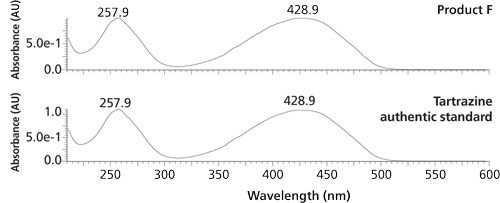 Figure 18: UV spectra of primary component in product F and an authentic sample of tartrazine (430 nm).