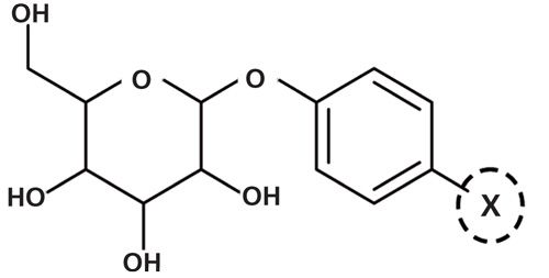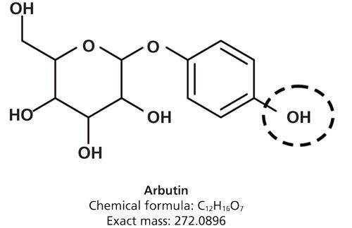 Product D was initially tested by Raman and NIR spectroscopy, which indicated a counterfeit material composed of a possible mixture of lactose, hydroxypropyl cellulose (HPC), and starch. The compound did not ionize upon LC–UV-MS analysis with either positive- or negative-ion ESI. The sample was found to dissolve completely in H2O, so a D2O solution was used to obtain structural information using NMR. The NMR analysis indicated a single, pure component. Comprehensive one-dimensional (1D) and two-dimensional (2D) NMR analysis were successful in elucidating the majority of the unknown structure as shown in Figure 11. Mass spectrometry was needed to identify the para substituent labeled as “X” in Figure 11 because it was not represented in the NMR data set. DCI was used to obtain a mass spectrum of the compound because ESI had failed in the preliminary LC–UV-MS sample analysis. The mass spectrum obtained from the DCI analysis is shown in Figure 12. The molecular formula was elucidated as C12H16O7 based on the DCI accurate-mass analysis. Coupled with the structural information obtained from the NMR analysis, the para substituent was identified as a hydroxyl (-OH) group. An internet search using the molecular formula resulted in the further identification of this compound as arbutin (Figure 13). Arbutin is used as a skin-lightening agent, generally in topical applications, and is extracted from the bearberry plant (21). Its toxicology upon oral ingestion is unknown. This case study shows another example of a counterfeit product that contains an active component whose indication is misaligned with the intended disease area of the authentic product.