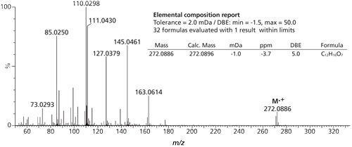 Positive-ion DCI with methane is used for the characterization of components that do not ionize adequately by LC–MS with ESI. The analysis is performed on a Waters GCT Premier system equipped with a DCI probe for sample introduction. The instrument is controlled using MassLynx v 4.1. The instrument is operated at a resolution of 7000 (FWHM) and the data is acquired over a range from m/z 50–700. Heptacosa (perfluorotri-n-butylamine) is introduced as an internal reference for accurate-mass measurement.