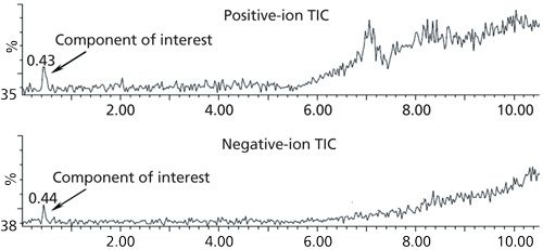 Figure 5: Positive- and negative-ion ESI total ion chromatograms of the product B extract.