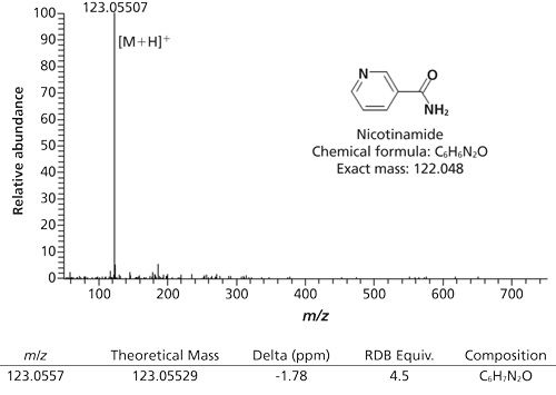 Product A tablet was confirmed as counterfeit by Raman spectroscopy and was suspected to contain ascorbic acid based on comparison of the Raman spectrum to spectra in the library. A portion of the counterfeit tablet was extracted with 50:50 acetonitrile-water and sonicated for 20 min. The extracted liquid was filtered and diluted (1:15) for LC–UV-MS analysis. Figure 2 shows the LC–UV chromatogram obtained from the preliminary low-resolution LC–MS experiment. Component 1 was ionized using negative-ion ESI and was confirmed to be ascorbic acid based on the determined molecular weight of 176 Da as shown in Figure 3. Detection of ascorbic acid was consistent with the initial Raman analysis. The molecular weight of component 2 was assigned as 122 Da based on the low-resolution mass spectrum. To obtain the molecular formula of component 2, the sample was analyzed on a high-resolution instrument using positive-ion ESI, as shown in Figure 4. For component 2, evaluation of possible elemental compositions resulted in a single formula (C6H6N2O). Because only a single formula possibility was obtained, the formula was entered into an internet search engine to obtain a list of matching structures. The internet search on C6H6N2O returned nicotinamide as a possible structure. Next, 1H NMR data of the extract were collected to check for organic compounds that may not have been visible in the LC–UV-MS analysis and to further confirm the structure proposals for component 1 and component 2. Component 1 and component 2 were confirmed by 1H NMR to be ascorbic acid and nicotinamide. No additional components were detected by NMR. The 1H NMR data were also used to determine the mole ratio of ascorbic acid:nicotinamide as 4:1 (qNMR). An internet search confirmed the availability of commercial vitamin supplements with ascorbic acid and nicotinamide present in the same ratio.