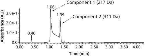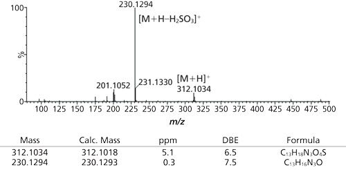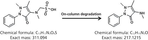 The general strategy that is used for testing counterfeit products has also been applied to the characterization of customer complaint samples. A complaint sample (product E) was received for characterization after preliminary testing by Raman and NIR spectroscopy indicated that the product contained within the bottle was not authentic. Visual examination of the packaging revealed the presence of pink residue on the threads of the dropper bottle, which indicates that at one point the bottle contained the authentic product (pink liquid), but was subsequently refilled with an unknown yellow liquid material. Two peaks, connected by a low horizontal plateau, were detected in the LC–UV chromatogram (see Figure 14). This type of peak shape is frequently indicative of an on-column interconversion or degradation (22). Molecular weights of 217 Da and 311 Da were assigned to these two observed components. The mass spectrum of the 311 Da component is shown in Figure 15. Accurate-mass data afforded molecular formula information. The compound was determined to contain sulfur, and a loss of H2SO3 was observed from in-source fragmentation. NMR analysis performed in parallel indicated the presence of a monosubstituted phenyl ring, three methyl groups, and a methylene group. The MS data coupled with the information obtained from the NMR analysis was used to elucidate the structures of the two compounds as shown in Figure 16. Based on the structures, on-column degradation could easily be rationalized. The primary component (311 Da) was identified as metamizole, a powerful analgesic and antipyretic (23) that is available over the counter (OTC) as a yellow solution. The indication for product E does not align with that of metamizole.