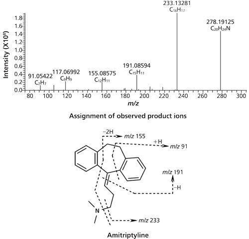 Product C was received and tested by LC–UV-MS after preliminary Raman screening confirmed its status as a counterfeit. No additional structural information could be gleaned from the Raman spectral analysis because the spectrum failed to yield a high-quality match with any of the compounds in the library. Similar to previous work, a portion of the counterfeit tablet was extracted with 50:50 acetonitrile-water and sonicated for 20 min. The extracted liquid was filtered and diluted (1:5) for LC–MS analysis. Figure 8 shows the LC–UV chromatogram at 220 nm that was obtained for the tablet extract, which indicates the presence of only one major component. The mass spectrum obtained for the major component observed in the HPLC analysis using positive-ion ESI is shown in Figure 9. The molecular weight of the compound was determined to be 277 Da. The elemental composition obtained from the accurate-mass measurement was C20H23N. This was the only possible formula returned by the software within the restricted accuracy window of 1.25 mmu. The formula was searched on the internet for possible structure matches and amitriptyline was the result. For additional confirmation of the identity of the counterfeit as amitriptyline, an accurate-mass product ion mass spectrum was collected and the product ion assignments are shown in Figure 10. All of the observed product ions are consistent with the identification of the active component of amitriptyline. As in the previous case studies, 1H NMR was used to confirm the structure of amitriptyline and ensure the absence of additional organic components. Amitriptyline is a tricyclic antidepressant that is used in the treatment of a variety of medical conditions including depressive and anxiety disorders, attention deficit disorder, hyperactivity disorder, migraines, eating disorders, insomnia, and bipolar disorder, among others (20). Though this product did contain an approved active pharmaceutical ingredient, amitriptyline, it did pose a significant risk to the patient because this compound is not an approved therapy or active against the target disease indicated for treatment with product C.
