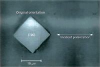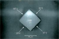 The CVD films consisted of diamond clusters whose edge lengths ranged from ~5 µm to 15 µm. The faces of the diamonds are square and triangular and presumably correspond to the (100) and (111) faces, respectively. We performed P/O micro-Raman spectroscopy on the isolated square faces to demonstrate the utility of this technique for the characterization of CVD diamond crystallinity. A reflected light image of one such square face from which P/O micro-Raman spectra were obtained is shown in Figure 3.