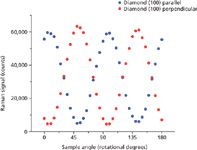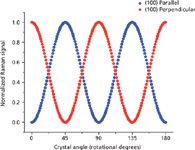 The first figure displays the theoretical results for polarization/orientation (P/O) Raman backscattering from a diamond crystal with the laser beam incident on the (100) face (1). The Raman signal is calculated for configurations with the polarization analyzer parallel and perpendicular as the crystal is rotated in the plane. The experimentally obtained P/O micro-Raman diagram generated by plotting the peak area of the 1333-cm-1 Raman band from a Drukker diamond (serving as our reference) is shown in Figure 2.