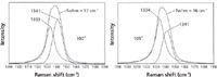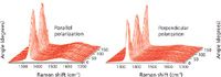 We obtained P/O micro-Raman spectra of diamond films prepared by chemical vapor deposition using a 1.6-mW, 488.0-nm laser beam focused to a 0.6-µm diameter with an Olympus MS Plan 100 (0.95 NA) objective. Raman scattered light was collected using the same microscope objective (backscattering configuration). An analyzer was placed in front of the spectrometer entrance slit and configured either parallel or perpendicular to the incident polarization. Individual spectra were collected at 5° rotational increments for each analyzer polarization configuration as the sample was rotated within the focal plane. The sensitivities of the microscope and spectrometer to the two, orthogonal polarizations were characterized against a depolarized white light source. Accordingly, corrections were made to the intensities of P/O micro-Raman spectra obtained at the corresponding polarizations.