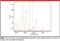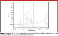 Figures 1, 2, and 3 illustrate the benefit of the display, thanks to the single-element spectra stored in the S3-base. The analyte and the influence of all the concomitant elements can be seen when present at their maximum level. Figure 1 shows the Eu 372.494-nm line, which has been validated. In the samples, if Nd or Ti do not exceed the maximum concentration that was defined in the software, this line will provide correct results. If not, the SOS tool should detect a positive bias and would reject this Eu line value. Figures 1 and 2 also show how useful and efficient the display is for the selection of the ideal positions for background corrections.