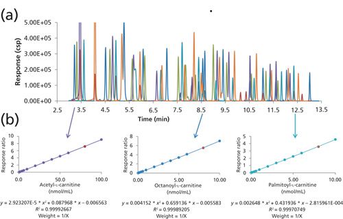 Figure 4: UHPLC–MS/MS chromatographic separation of acyl-L-carnitines, and quantitation using multiple-point calibration curves. (a) A high calibration curve point UHPLC–MS/MS chromatogram, constructed from 66 standardized acyl-L-carnitines and 12 internal standards. Internal standards are colored red. Data were collected using optimized MS/MS transitions for each acyl-L-carnitine pentafluorophenacyl ester. (b) Representative calibration curves constructed from 13 calibration points for a short-chain acyl-L-carnitine (acetyl-L-carnitine; purple arrow pointing from purple colored acetyl-L-carnitine to its purple calibration curve), a medium-chain acyl-L-carnitine (octanoyl-L-carnitine; blue arrow pointing from blue octanoylcarnitine to its blue calibration curve), and a long-chain acyl-L-carnitine (palmitoyl-L-carnitine; aqua arrow pointing from aqua palmitoyl-L-carnitine to its aqua calibration curve). The red calibration curve point on each calibration curve in (b) was derived from the specific calibration curve point in the UHPLC–MS/MS chromatogram shown in (a).