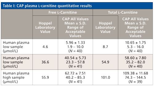 Table I contains quantitative data from our participation in the College of American Pathologists Biochemical Genetics Survey program (21), which distributes identical samples for analysis by participating laboratories. Most (90%) of the participants use tandem MS, and although the mean values from all participants are close to the values we determined using UHPLC–MS/MS (with standardized calibrants and multiple-point calibration curves), the range of acceptable values is enormous. For example, the low free L-carnitine value range is fivefold (1.9–10 µmol/L), the normal free L-carnitine value range is 2.5-fold (23.3–57.8 µmol/L) and the high free L-carnitine value range is twofold (40.2–85.3 µmol/L). Contrast these values with our internal results, which are shown in Table II. Here we combine previously published data generated using our radioenzymatic method in 1981 (9) and our HPLC–ion-trap MS in 2008 (18 19), along with unpublished HPLC–UV data from 1999, using plasma and urine samples from paid volunteers at the VA Medical Center in Cleveland, Ohio. Also shown are previously published data from our radioenzymatic method versus our HPLC–fluorescence method, with values from the analysis for human skeletal muscle as part of an exercise study (15). The plasma values are identical regardless of methodology, and the values from urine and skeletal muscle are only slightly different, probably because of urine sample collection differences and different sections of tissue used for analysis.