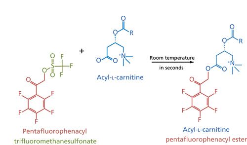 Figure 2: Derivatization of acyl-L-carnitines with pentafluorophenacyl trifluoromethanesulfonate. The reaction of pentafluorophenacyl trifluoromethanesulfonate with acyl-L-carnitines was performed at room temperature and was complete within seconds. Unlike the tandem MS “profile” derivatization using HCl in n-butanol with heating at 65 °C for 15 min, acyl-L-carnitine derivatization with pentafluorophenacyl trifluoromethanesulfonate results in no hydrolysis of acyl-L-carnitines.