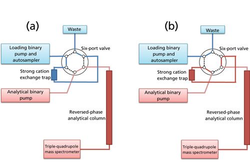 Figure 3: Instrument configuration for sequential ion-exchange–reversed-phase chromatography. (a) Acyl-L-carnitine pentafluorophenacyl esters are loaded onto the strong cation exchange trap using the loading binary pump following an autosampler injection. (b) After removal of excess derivativation reagent, the six-port valve is triggered and acyl-L-carnitine pentafluorophenacyl esters are forward flushed onto the analytical column using the analytical binary pump. We employed this strategy for two reasons: on-line removal of excess derivatization reagent before detection of the acyl-L-carnitine pentafluorophenacyl esters, and the ability to solubilize the whole range of acyl-L-carnitines (from acetyl- to stearoyl-L-carnitine) while maintaining good chromatographic selectivity for the short-, medium-, and long-chain acyl-L-carnitines, in a single 14-min chromatogram.
