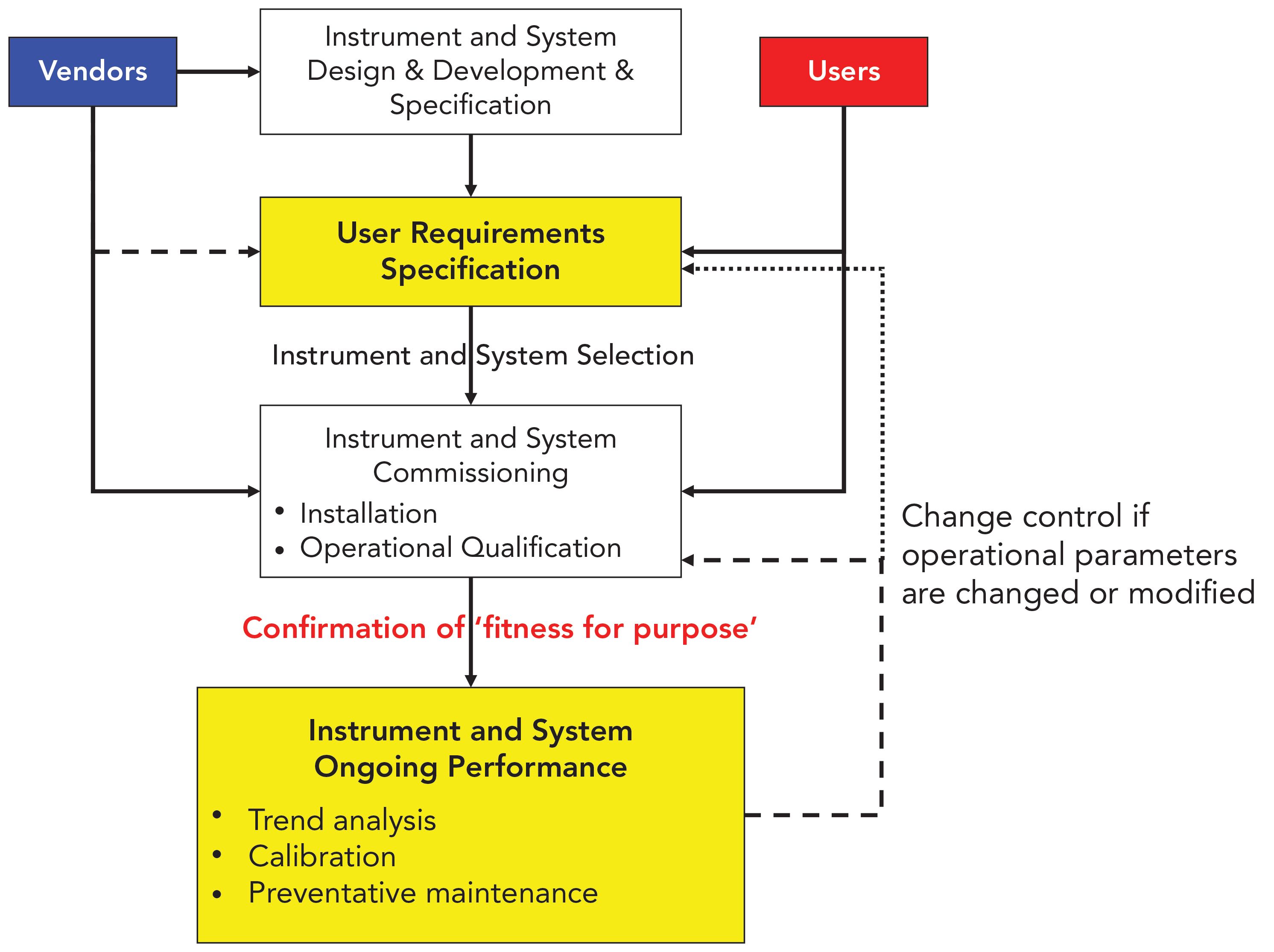 The perennial question of “who does what and when” is answered in the lifecycle approach to calibration shown in Figure 4. The solid lines denote the primary process flows for establishing and confirming “fitness for purpose.” Dotted or dashed lines indicate either feedback loops triggered by data generated during the ongoing performance phase or, in the case of the URS, supported by the vendor.