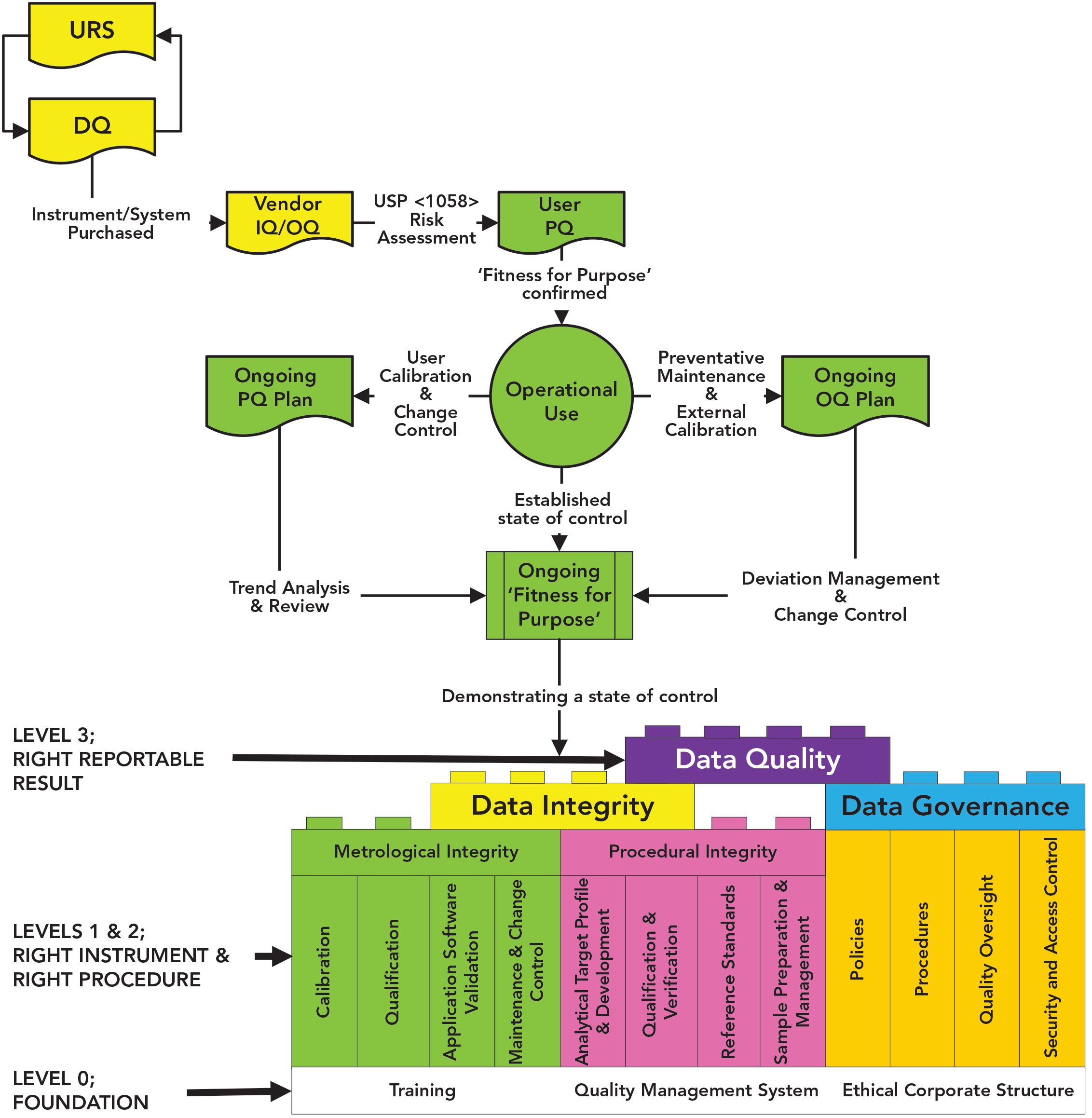 The levels of the AIS, with a specific focus on analytical instruments and systems, are presented at the bottom of Figure 3. Levels 1 and 2 are broken down into four elements each to provide metrological and procedural integrity, respectively. Levels 1 and 2 also overlay the culture and ethos of the foundation level. The quality oversight and some of the foundation level elements of the model are combined under data governance. Together these provide the essential requirements for the right reportable result at level 3 with associated data quality to ensure the correct decision is made.