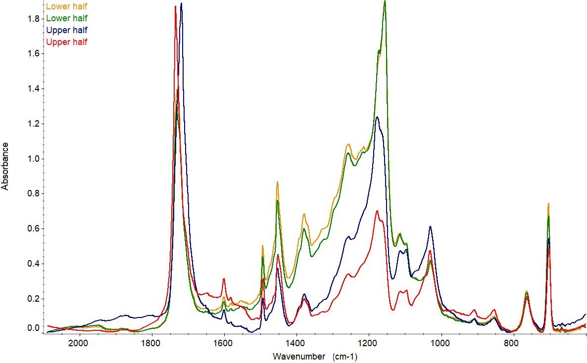 A subset of the data is presented here for presentation clarity (Figure 1). Upon a closer inspection of the fingerprint region, there are some small differences as a function of position (upper versus lower area of the sample foil) in the spectral band shapes and band ratios at 1180, 1160, 1120, and 1100 cm-1. This would suggest that either the chemical composition of the coating was slightly different in these areas or that processing conditions could be responsible.