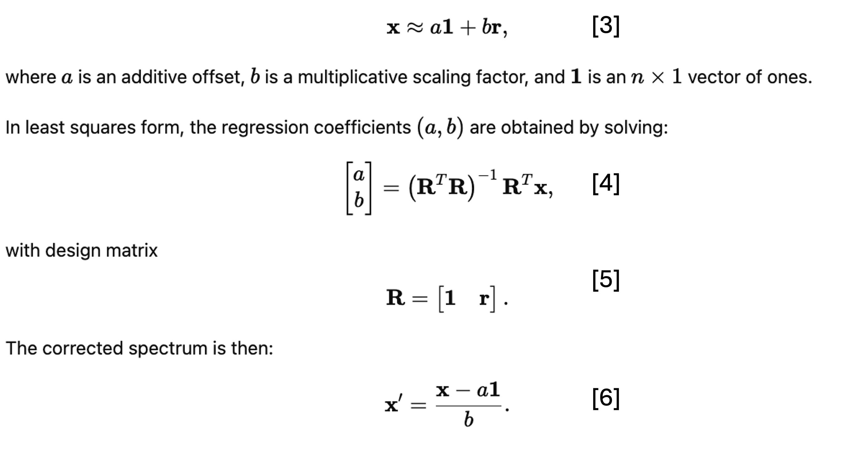 MSC was introduced to correct both additive and multiplicative scatter effects in diffuse reflectance spectra. The method assumes that each measured spectrum can be approximated as a linear transformation of an ideal reference spectrum (7).