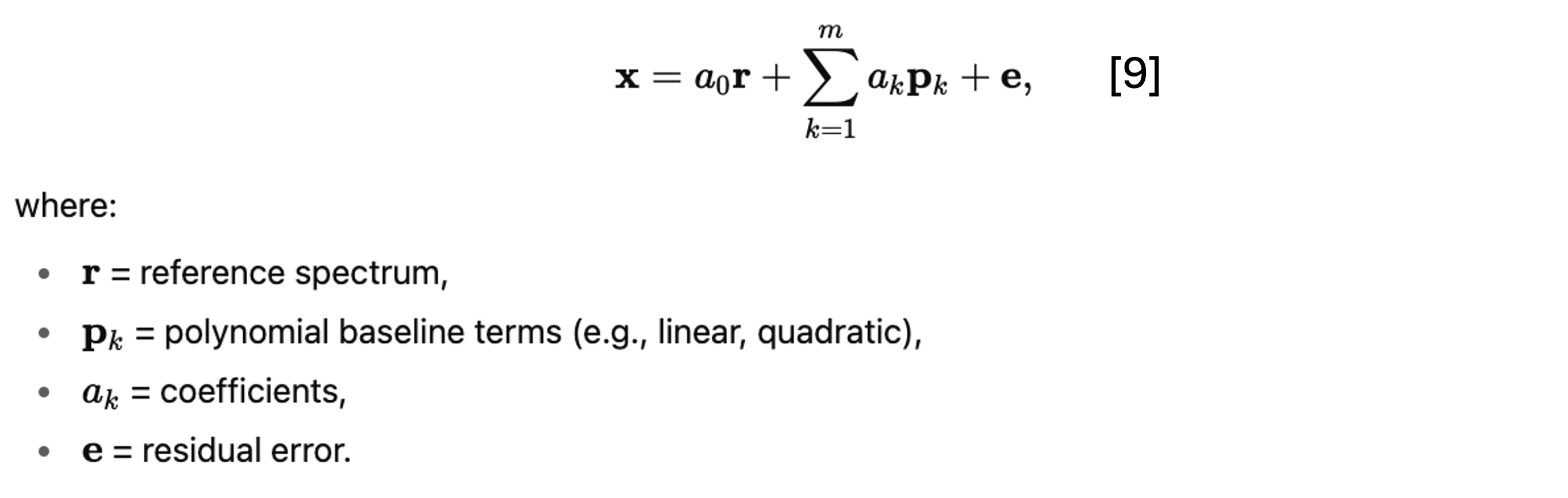 EMSC generalizes MSC by modeling the measured spectrum as a combination of reference spectra, polynomial baseline trends, and possible interferents (9).