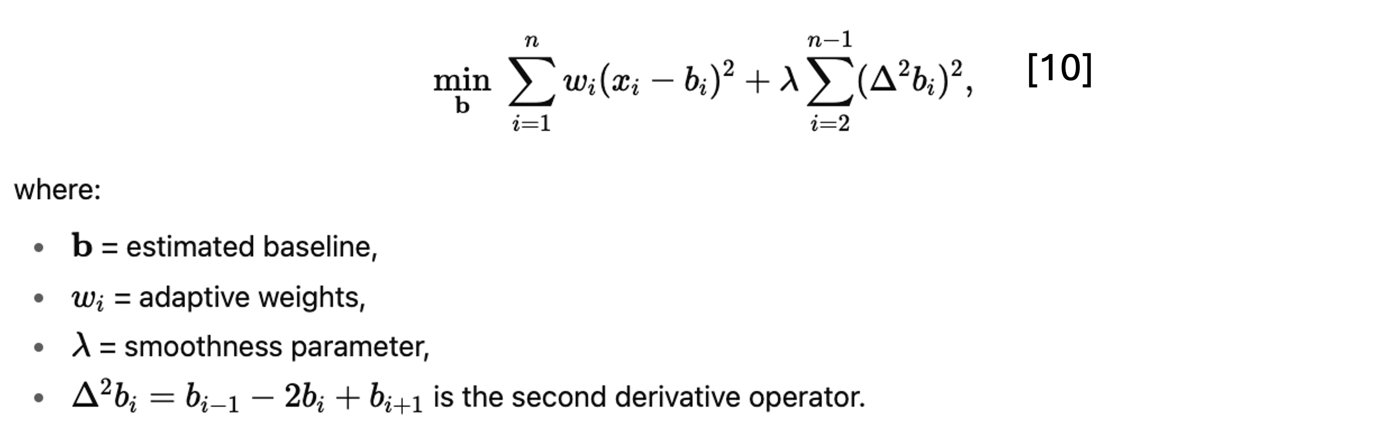 AsLS estimates the baseline as a smooth function penalizing positive and negative residuals differently (11).
