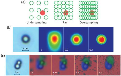 Figure 3: (a) Schematic of sampling modes and their effect on Raman imaging of small individual (b) PS and (c) adjacent PS–PMMA beads shown in the left light images. (c) Raman images are shown semi-opaque and overlaid on the light image. Numbers on the images indicate sampling steps in micrometers.