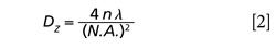 In a confocal arrangement, more thorough estimation of the sampling depth should be done with the use of the PSF. Practical calculation of the effective PSF is a quite complicated task that requires taking into account the details of the optical design of a given confocal Raman microscope, quality of the optical components, characteristics of the laser beam, and various other factors. Nevertheless, the elongated axis of the prolate spheroid may be approximated by the following equation: