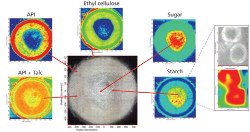 Figure 4: Light (center) and Raman images of a circular cross-section of 1-mm solid bead dosage form generated as spectral correlations with reference spectra of the corresponding compounds-the red color indicates the areas of the highest correlation and, thus, concentration of the compounds. The insert (right) shows spherical starch particles mapped using a 100×/90 objective and 3-μm sampling step.
