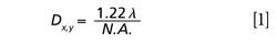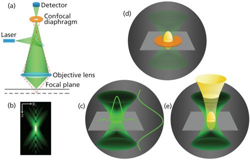 When the laser beam is focused by an objective with a high numerical aperture, the size of the laser spot is determined by the diffraction limit of light and hence by the laser excitation wavelength. The illuminated volume (the hourglass in Figure 1c) can be characterized by its “waist” or a diameter of the laser spot in the XY focal plane approximated by Airy disk: