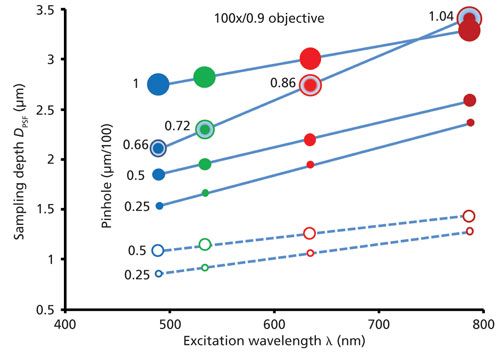 Figure 2: Sampling depth DPSF as function of the excitation wavelength and the spectrograph pinhole. The colors of the circles codify the wavelengths: blue = 488 nm, green = 532 nm, red = 633 nm, and dark-red = 785 nm. The diameters of the circles are proportional to those of the pinholes of 100, 50, and 25 µm. Filled circles (solid lines) correspond to refractive index n = 1.5, clear circles (dashed lines) correspond to n = 1. The sampling depths calculated for pinholes equal to the Airy disk diameters for each excitation wavelength are shown by circles with the dots inside.