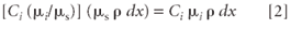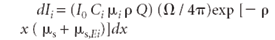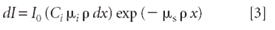 Some of the radiation that reaches this volume element is absorbed. The fraction of radiation intensity (dI) absorbed is just (μs ρ dx). However, only some of this incoming radiation intensity is absorbed by element i. This fraction is the concentration of the element multiplied by the ratio of its mass absorption coefficient to that of the sample (Ci [μi /μs]). Therefore, the absorption by element i in the volume element under consideration is given by