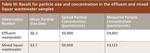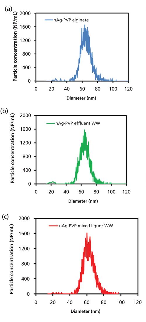 Next, the Ag ENPs were measured in a 6 ppm alginate solution. Once the accuracy of the technique was ensured, it was followed by the measurement of the effluent wastewater and mixed liquor samples. First, the total Ag concentration was measured in both wastewater samples and was found to range from 25 to 40 ppt, levels that should not inhibit the determination of Ag ENPs. Figure 7a shows the Ag particle size distribution for 0.1 ppb (50,000 particles/mL) in the alginate sample, which corresponds to a mean particle size of 66.1 nm, with a concentration of 52,302 particles/mL. The agreement between the measured and TEM-determined particle sizes indicates that the alginate matrix does not affect the measurement accuracy as exemplified in Figures 7b and 7c, which show the measured particle size distributions for the effluent and mixed liquor respectively. Table III shows the measured particle sizes of both samples that agree with the certificate value, together with particle concentrations, which are close to the calculated value, indicating that neither of the wastewater matrices impact the measurement and strongly suggesting that Ag ENPs can be successfully measured in wastewater samples.