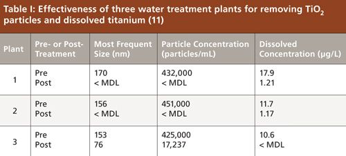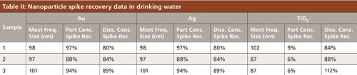 SP-ICP-MS is an ideal tool for assessing the efficiency of drinking water treatment systems in removing silver, gold, and titanium dioxide (TiO2) nanoparticles without using any other analytical technique. To evaluate the effectiveness of the water treatment process for these types of nanoparticles, Donovan and colleagues (11) collected water samples both pre- and post-treatment at three water treatment plants in Missouri. None of the six waters contained measurable amounts of Ag or Au, either as particles or dissolved species. However, all source water samples contained TiO2, as shown in Table I. Plants 1 and 2 effectively removed both dissolved Ti and TiO2 particles, as evidenced by the lower amounts present in the post-treatment waters than the pretreatment samples. The results from Plant 3 differed from the first two plants in that Ti-containing particles could still be detected after treatment, although significantly less than the pretreatment sample. However, all the dissolved Ti was removed.