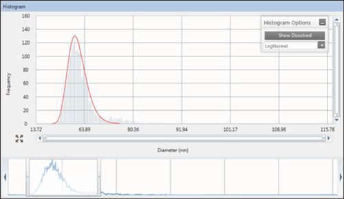 An interactive view of data acquisition of intensity as a function of time for the 60-nm nominal diameter silver nanoparticles is shown in Figure 5. In this example, the concentration of the analyte was 208 ng/L and was converted to volume and then into size knowing the density and the geometry of the particle using the Syngistix Nano Application Module, with no further need for manual data processing.