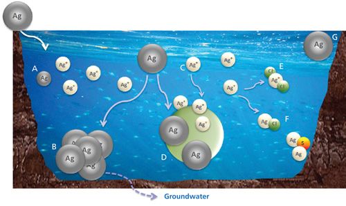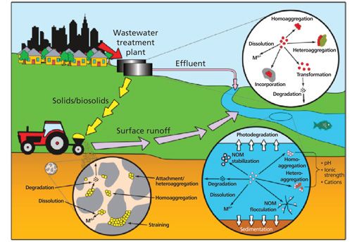 Nanomaterials from domestic, medical, and industrial sources may also undergo significant changes during wastewater cleaning processes, such as the conversion of silver nanoparticles to silver sulfide in treatment plants. In addition, aggregation of the nanomaterials with other minerals and organic matter in the wastewater often results in the nanomaterial combining with other solids in the effluent, rather than remaining as a dispersed nanoparticle suspension. So, apart from atmospheric deposition or accidental spillage of nanomaterials directly into rivers, lakes, and the surrounding land, wastewater treatment remains by far the largest source of nanomaterial contamination either from the runoff into groundwater sources and drinking water supplies or from the raw sewage sludge that is often spread onto the soil as a fertilizer (1).