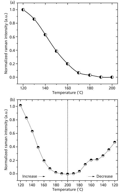 Figure 4: Normalized intensity (peak area) of the Raman peak at 1126 cm-1 as a function of temperature, as obtained from the “high resolution” Raman spectra. (a) For increasing temperatures from 120 °C to 200 °C it is possible to see that intensity decreases with increasing temperatures; above 170 °C this intensity converges to zero. (b) For a cycle with increasing and then decreasing temperatures between 120 °C and 200 °C it is possible to see that the Brill transition is a reversible process, since the band at 1126 cm-1 (Brill Raman band) emerges again when the temperature of the sample decreases below the Brill temperature.