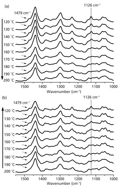 Figure 2: Raman spectra of nylon 6,6 collected in the wavenumber range from 1000 cm-1 to 1550 cm-1 (“high resolution”) as a function of temperature (a) for increasing temperatures from 120 °C to 200 °C and (b) for decreasing temperatures from 200 °C to 120 °C. The highlighted band at 1126 cm-1 is due to a C-C skeletal stretching mode, and the band at 1479 cm-1 is due to C-N and N-H bending modes.