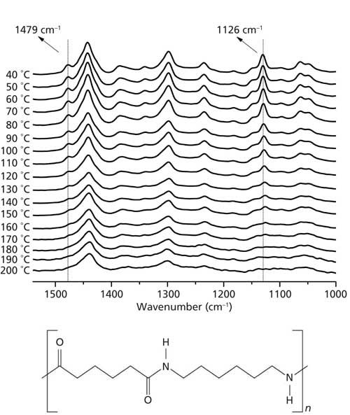 We carefully analyzed all Raman peaks of the nylon 6,6 sample as a function of temperature. The peaks at 1126 cm-1 and 1479 cm-1 shown in Figure 1 (obtained from the full range spectra) display substantial changes in their intensities between 40 °C and 200 °C. It is possible to recognize in Figure 1 that these peaks at 1126 cm-1 and 1479 cm-1 disappear between 160 °C and 180 °C.