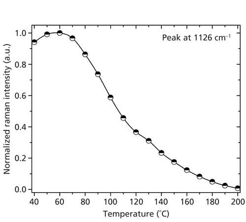 Figure 3: Normalized intensity (peak area) of the Raman peak at 1126 cm-1 as a function of temperature, as obtained from the full range Raman spectra. Note the intensity decrease with increasing temperature; above 170 °C, this intensity goes to zero.