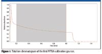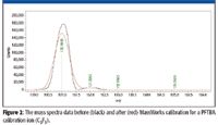 Figure 1 shows the total ion chromatogram of the first PFTBA run and the 0.8-min retention time window used for the mass spectral averaging before the calibration. Figure 2 shows the profile mode mass spectrum before and after the calibration for the calibration ion C3F5+ . This demonstrates that the raw profile mode mass spectrum, although very well tuned, does not have a known or defined peak shape, whereas the calibrated mass spectrum does have a known and mathematically defined peak shape. The calibrated mass spectrum also has been shifted properly to the correct mass position given by the monoisotopic mass of this calibration ion. As a convention and without the loss of generality, the mass difference due to the gain or loss of an electron is ignored throughout this article and the exact mass corresponds to that of the neutral form of the same ion.