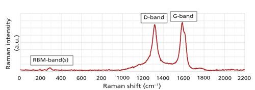 Figure 2: 785-nm Raman spectrum of carbon nanotubes measured at 30-mW laser power. Low RBM/G-band intensity ratio combined with high D/G band intensity ratio may indicate that the 785-nm laser partially destroys CNTs at the laser power density used in this study (see the text for detailed discussion).