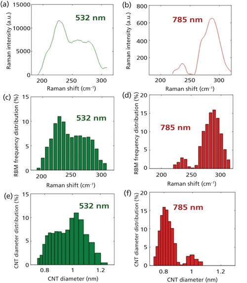 Figure 3 demonstrates that RBM band profiles and the resulting CNT diameter distributions obtained from the 532-nm Raman spectra differ from those obtained from the 785-nm Raman spectra. This is despite the fact that both 532- and 785-nm Raman measurements were taken on the identical CNT samples, and using the same laser power of 30 mW on both 532- and 785-nm instruments.