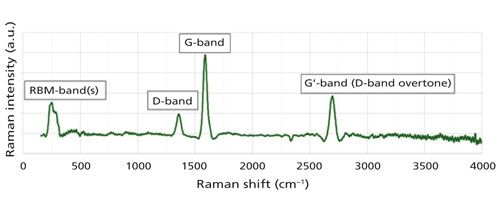 CNT Raman spectra can provide information about the CNT diameter, chirality, structural quality, conductor or semiconductor character, crystallinity, and degree of functionalization (5–8). A brief introduction to major Raman features of carbon nanotubes is given below.