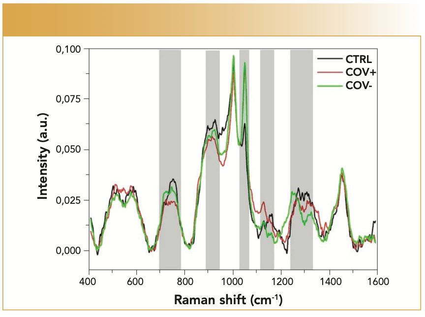 Recently published results indicate that reagent-free SERS on saliva samples has promise. For example, a team of Italian researchers tested approximately 90 subjects that were divided as equally as possible between Covid-positive, Covid-negative, and control subjects. Saliva samples were collected and centrifuged (to remove food debris), then 3 μL of the saliva samples were deposited on a glass slide covered in commercially available aluminum foil to promote the SERS effect. A Horiba Raman microscope was used with a 785 nm laser to collect the SERS spectra. The averaged spectra from the control, Covid-positive, and Covid-negative subjects are shown in Figure 1. When spectra were analyzed using a multivariate chemometric model and a convolutional neural network, the method could distinguish between the three types of subjects with 84% sensitivity and could detect Covid-positive subjects 92% of the time (3). One disadvantage of this study was that it was conducted on an older population with a large number of patients who were critically ill and who, upon imaging, exhibited symptoms of pneumonia.