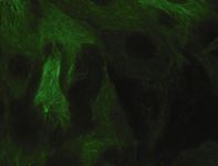 Figure 6: Image of microtubule end-binding protein EB3 fused to mEmerald fluorescent protein expressed in pig kidney epithelial cells (LLC-PK1 line). The stable cell line was provided by Michael W. Davidson of FSU. This image was captured on an Olympus IX81-DSU with a 60X UPLSAPO, NA 1.35 and Hamamatsu's ORCA-Flash2.8 CMOS camera.
