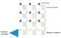 A CCD image sensor consists of a two-dimensional array of photodiodes, which are optical detection elements that convert light into electric charge, with storage wells or buckets that capture the charge. The bucket can accumulate charge for very long periods of time if the dark noise is reduced by cooling. To obtain an image, the accumulated charge must be transferred from one horizontal row to the one below until it reaches the readout register (Figure 1). In the readout register, the charge is transferred horizontally to the readout amplifier.
