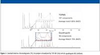 Figure 5 shows an example of a juniper oil sample that was analyzed under identical chromatographic conditions on both quadrupole and TOF-MS detectors. As a result of factors discussed in this document, such as acquisition rate and spectral continuity, the advantages of TOF-MS are made evident. In this example, 137 components were detected and identified by TOF-MS with an average library match of 85%. In the same sample, only 96 components were detected and identified on the quadrupole MS with an average library match of 75%.